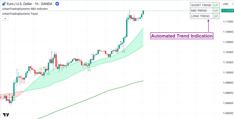 Urban TradeFinder scans 24h the market to identify the demand and supply zones with identifications on the candle stick patterns indicating the origin of the Strong move. Also it generates Alerts automatically once the supply or demand area is formed thus by reducing the hours spent on the charts and reducing the missed trade Opportunities as well.Buy/Sell Alerts:Green Diamond + DZ Sign ---> Indicates the Demand Zone Formation. Place Buy Trade upon Entry Criteria Met